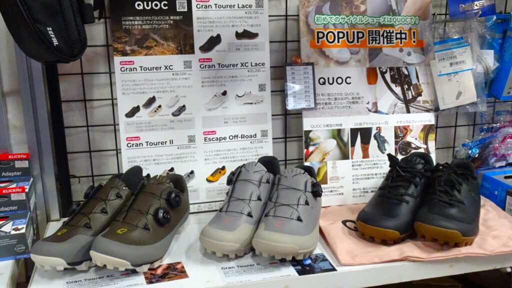 店内のシューズコーナーにイギリスのブランド「QUOC」のシューズを展示しております。「アンテナショップのポップアップ」として期間限定での展示です。