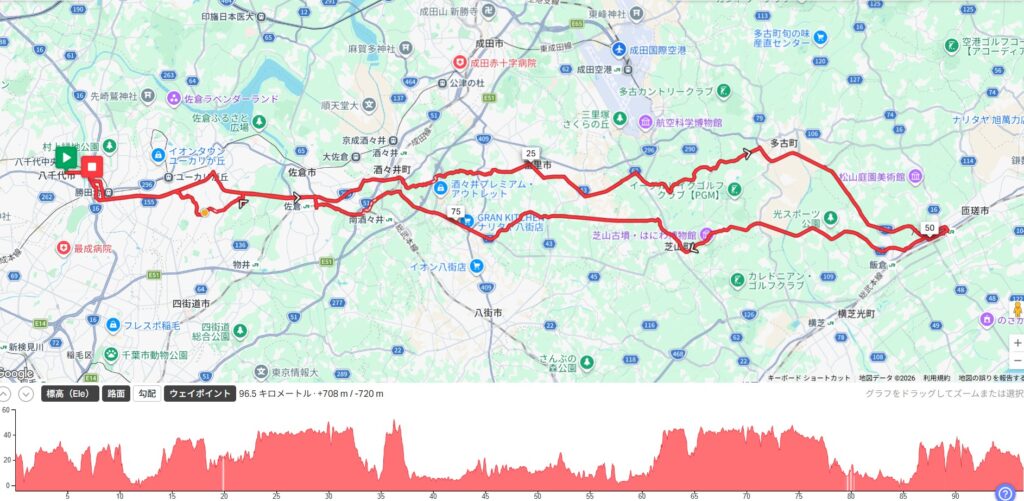 9時に八千代をスタート。八日市場11時着の目標で走ろう。