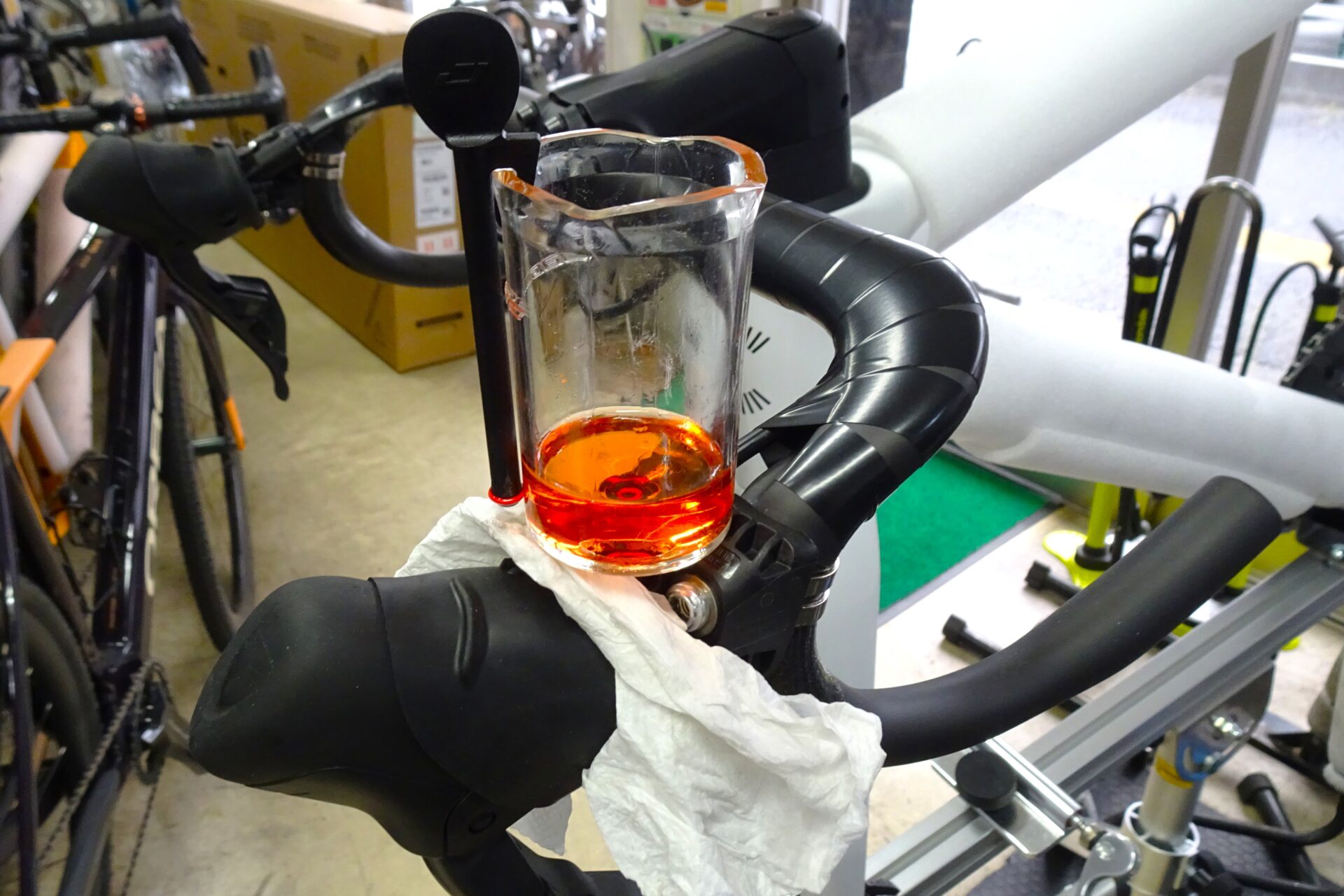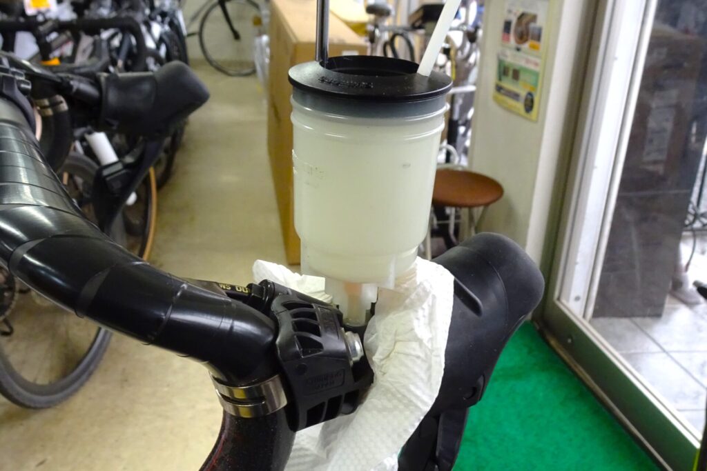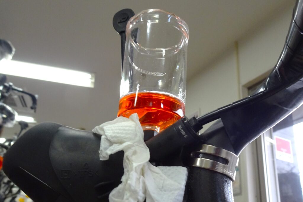 上写真はシマノ純正のブリーディングカップです。不満のある工具ですが、いままでずっとこれを使ってきました(これしか無いんで…)。