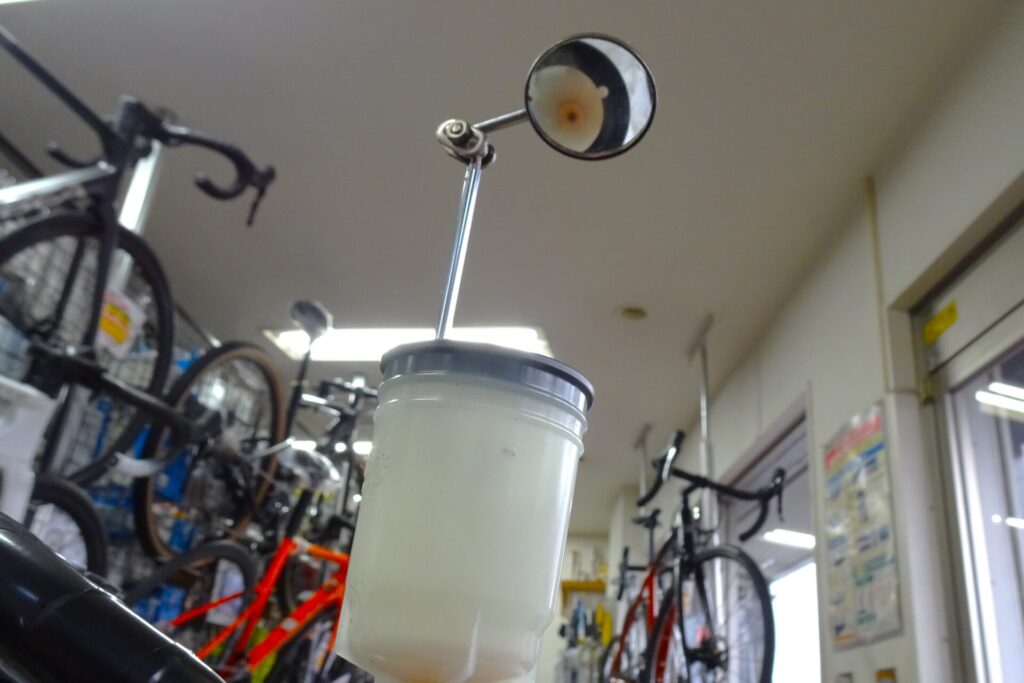 なので私は上写真のように小さい鏡をカップに付けてカップ内を覗いていました。ブリーディング作業はバイクの下や横からオイルを注入するので、こうでもしないとカップ内の状態が確認できないのです。