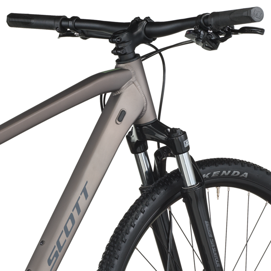 スコットのクロスバイク「SUB」シリーズは、他社のクロスバイクに比べるとかなり太めのタイヤを履いているのが特徴です。KENDAの700×45cのブロックタイヤを履いて、フロントギアはシングルで「砂利道の登りもガリガリ行けるよ」というノリのクロスバイクです。フロントサスペンションも装備し、悪路走破性を更に高めた”MTBに近いクロスバイク”です。