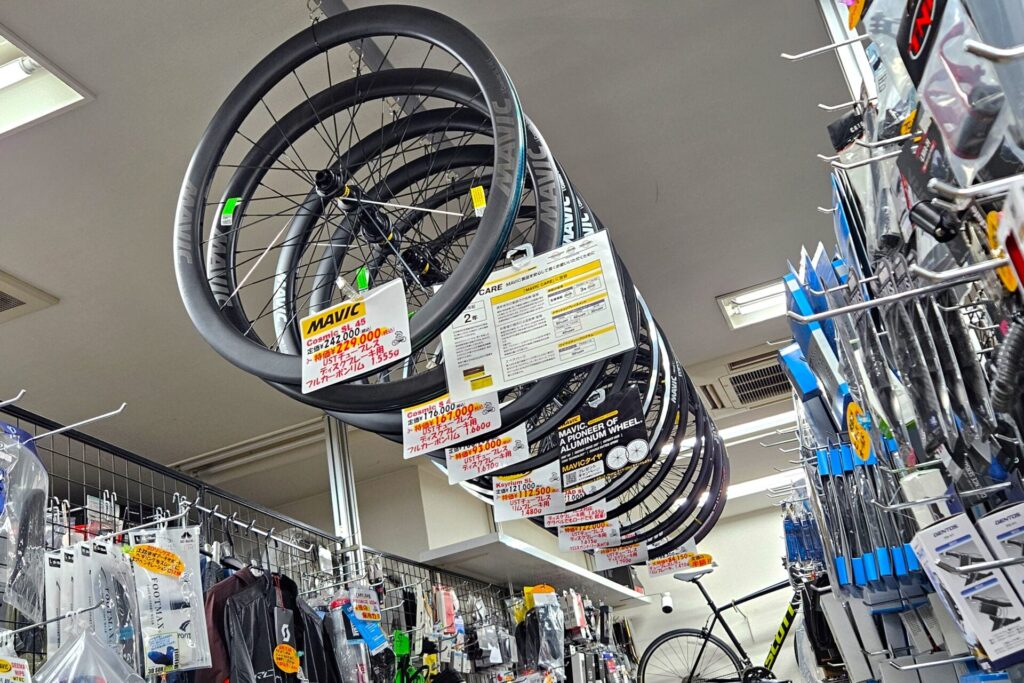 「Ksyrium SL リム」(上写真)は当店価格¥112,500、重量は1,480g、「まだまだリムブレーキロードで走るよ」という方は是非どうぞ。