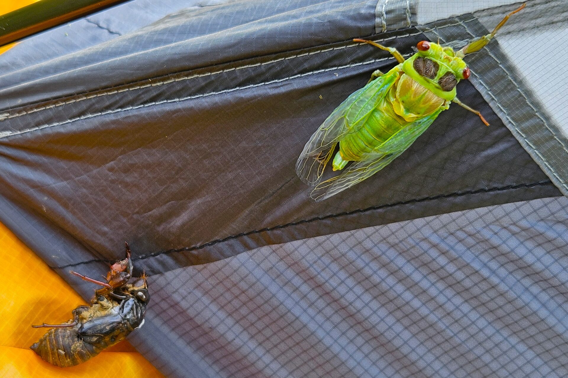しかしテントを畳んでいる途中で撤収作業中断。俺のテントでセミが脱皮している。羽化するのをのんびり待ちました。