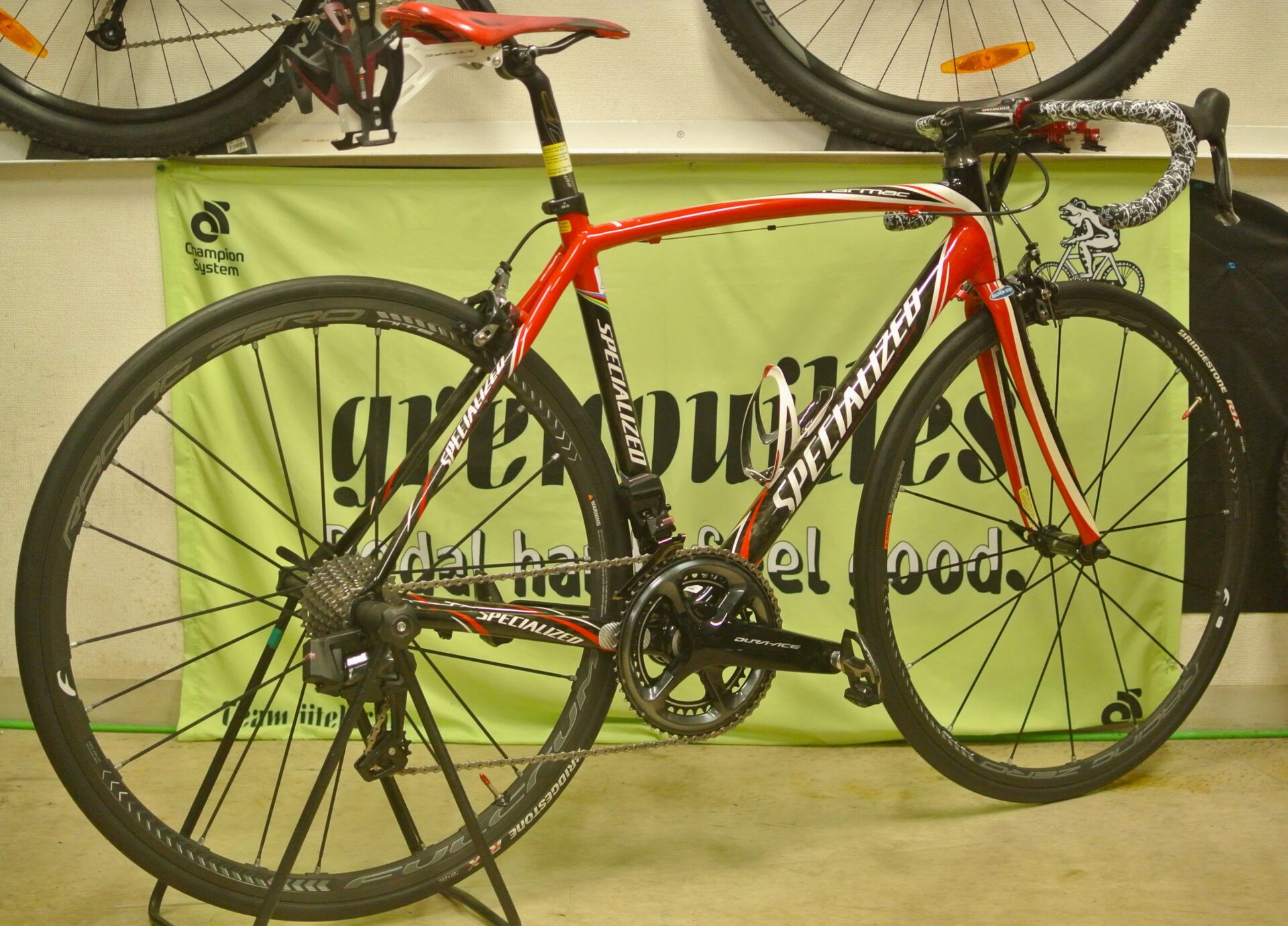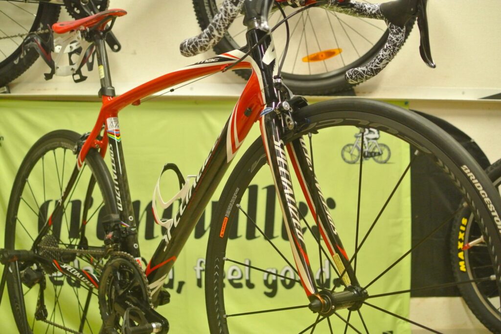 お客様YさんのSpecialized/Tarmacです。QuickStepカラーの初代ターマック、かっこ良いですね、20年前のロードバイクには見えないですね。
