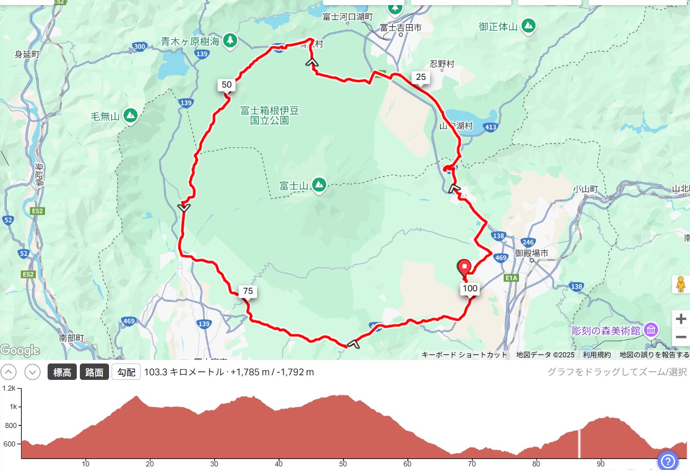 距離105km・獲得標高1,650mのこのルート、登り難易度はそれなりに高く、あっさりとは一周させてくれません。初心者サイクリストにとっては「初級卒業」みたいなルートです。