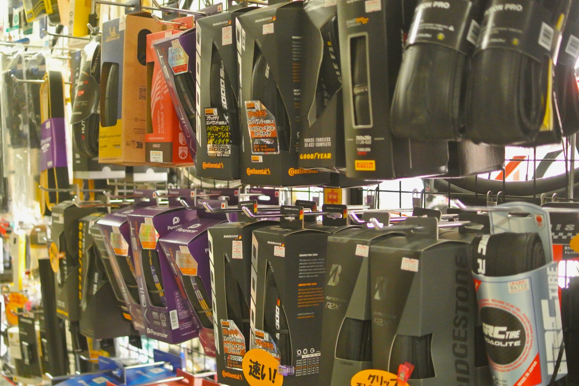 タイヤもそのうちの一つです。クロスバイク向け・入門ロードバイク向けのタイヤを常に大量に在庫するようになりました。