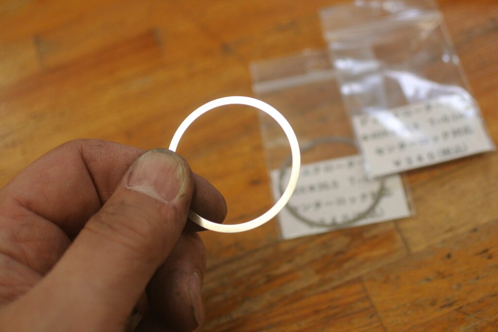 使ったのはこの輪っかです。Benefitの「ディスクローターシム」という製品です。厚さ0.1mmのアルミ製のシムで、これをホイールとディスクローターの間に挟むことでディスクローターの位置をずらすのです。