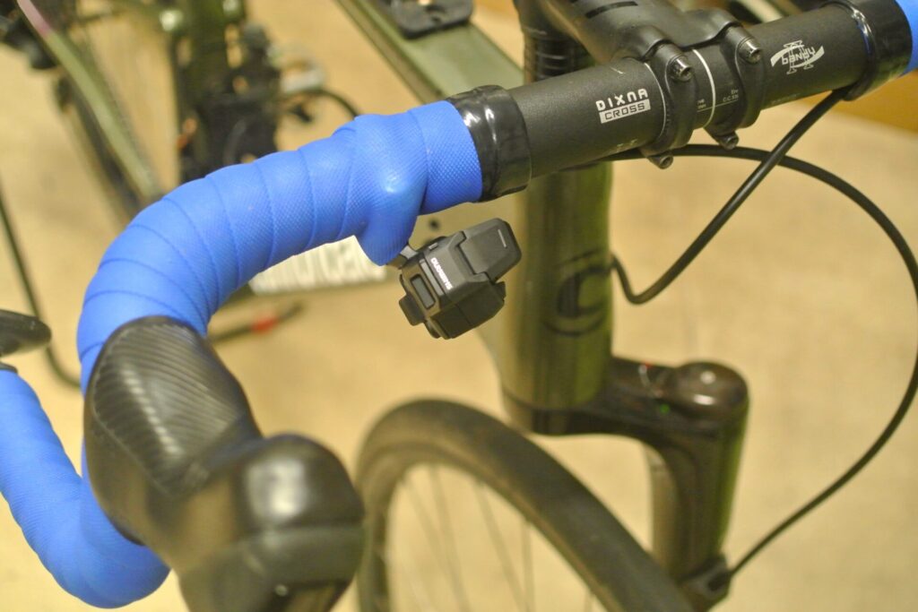 マニュアルシフトはとりあえずこのワイヤレススイッチを使います。このシフトスイッチ(SW-EN605-R)、本当はフラットバーハンドル用なのですが強引にドロップハンドルに付けちゃいました。