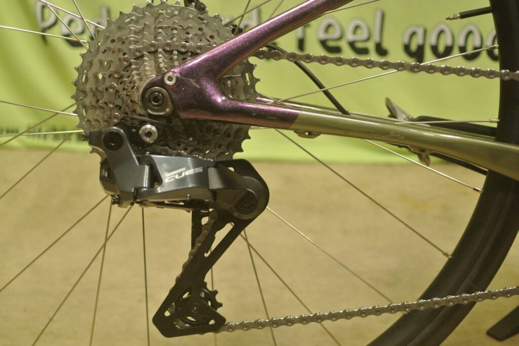 リアディレーラーとハブを接続。ハブから伸びたケーブルをリアディレーラーのDi2ポートに繋ぐのが新鮮。だけど後輪脱着の前に必ずこれを抜いておかないと断線の恐れがあります。