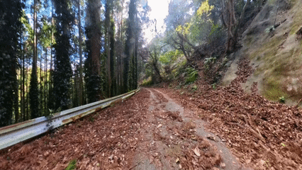 舗装区間も小石・枝・落ち葉・木の実・苔が路面を覆っています。舗装荒れによる段差も多い。25~28cスリックタイヤを履かせたロードバイクのお客様をこの道に連れて行くのは止めたほうが良いかな…