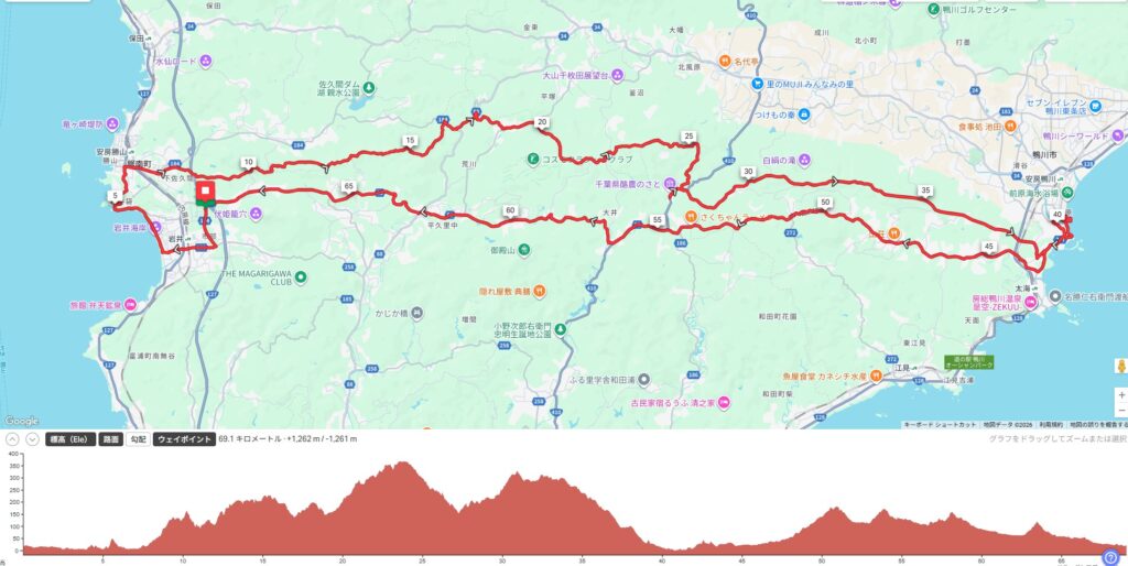 嶺岡中央林道は南房の低山を幾つも越えて房総半島を横断するルートです。獲得標高は大したこと無いけど、斜度のキツい坂ばかりなので登り難易度はそれなりに高いです。