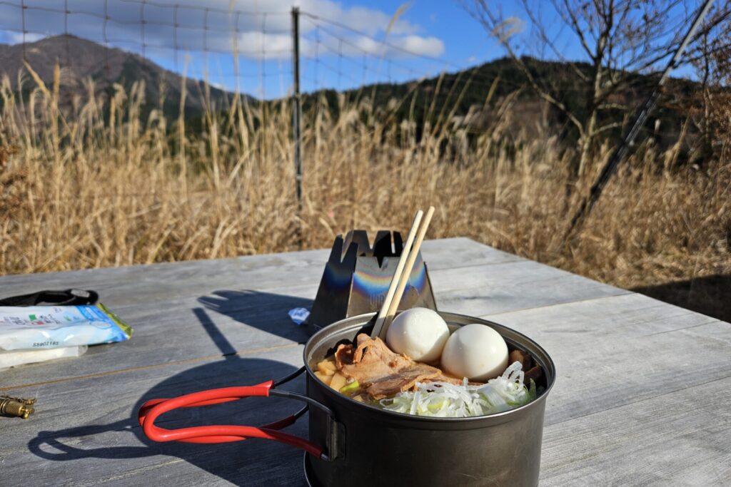 ちょっと登って菩提峠で昼食。名水を沸かしてラーメンを茹でます。