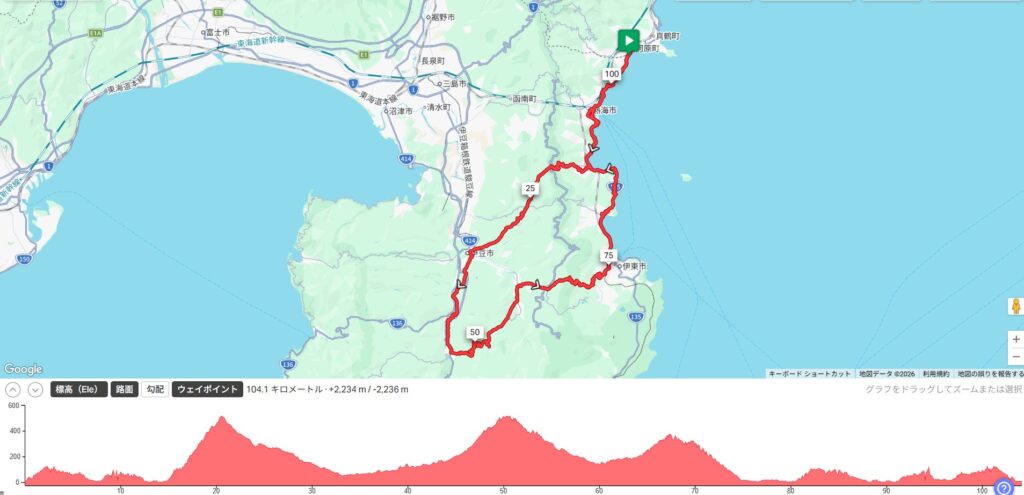 Teamじて吉サイクリングプランナーのI田さんが久し振りに定休日ライドを企画してくれました。舞台は伊豆半島の北東エリア。湯河原を起点に熱海~修善寺~月ヶ瀬~伊東を巡る、距離104km・獲得標高2千mのルートです。今週の定休日はこれを6名で走ってきました。