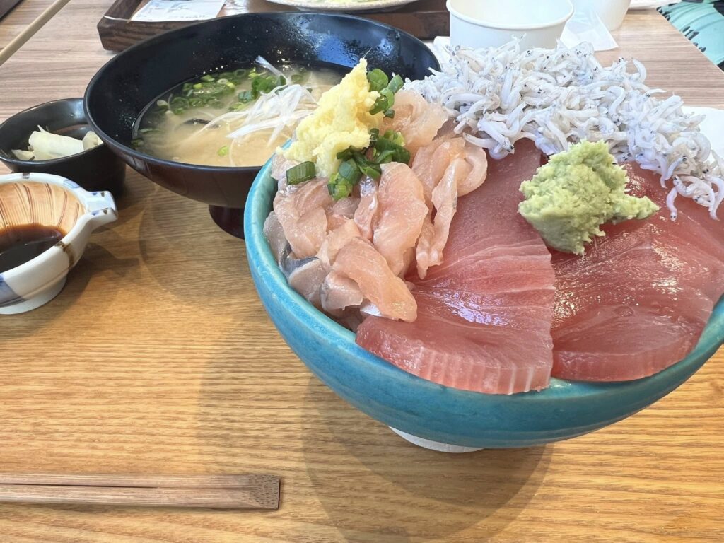 修善寺からしばらく南下して「道の駅 伊豆月ヶ瀬」で昼食。海の幸・山の幸、そして地産のワサビを味わえる料理が揃っています。