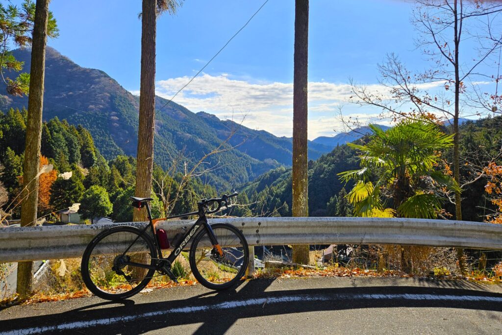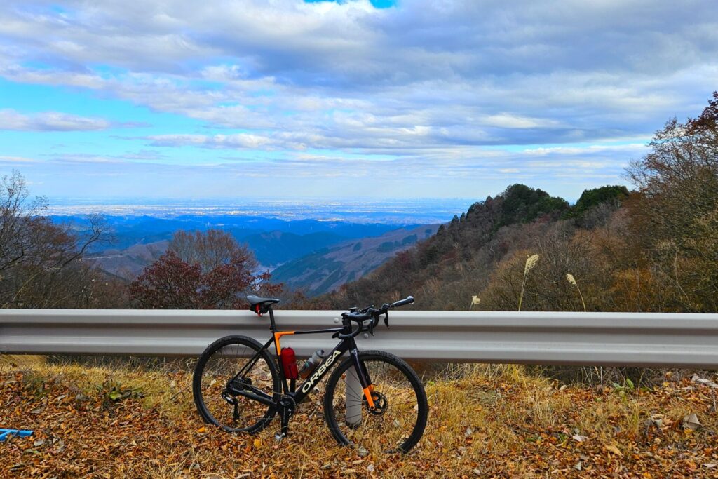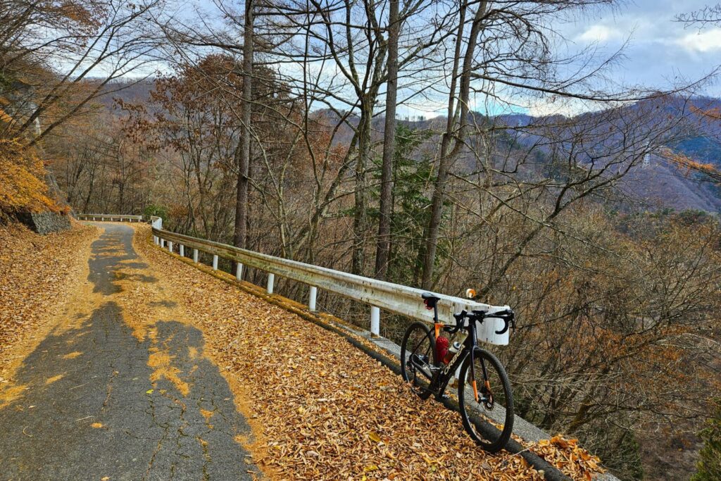 木々の葉が散り落ちて、いま走ってきた道や隣の山がくっきり見えます。