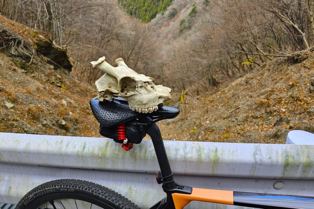 人影は皆無。路面を覆った落ち葉をザクザク踏みしめる音が響きます。鹿の頭蓋骨と記念撮影。