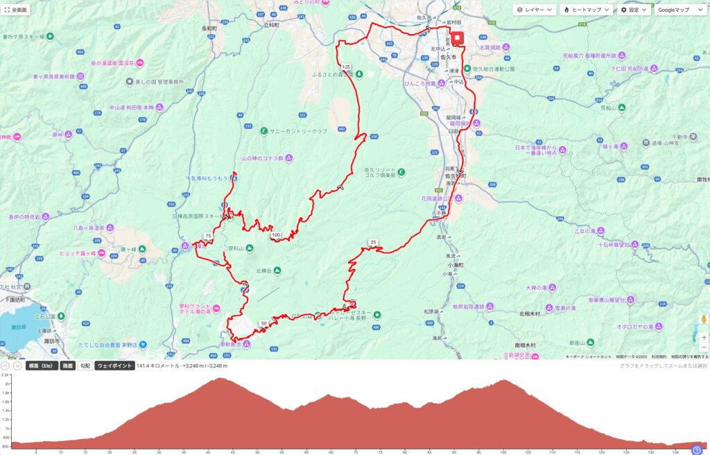 こんなルートです。起点は佐久市街。一日目はJR小海線沿いに南下し、R299で麦草峠を越え、ビーナスラインで白樺湖へ、そしてキャンプ場へ。