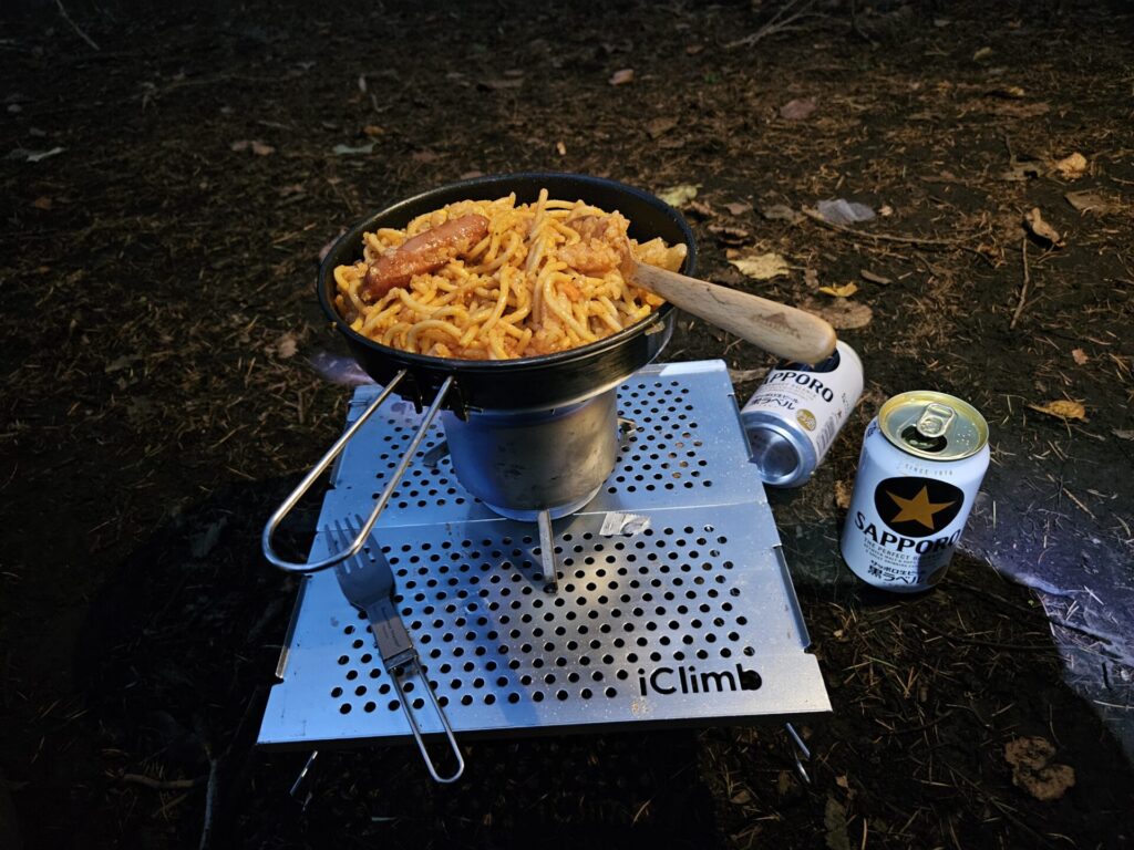 この得体の知れない食い物は、ローソンのナポリタンと尾西のエビピラフとウィンナーソーセージとミックスビーンズを混ぜて炒めたキャンプ飯です。美味かったぜ。