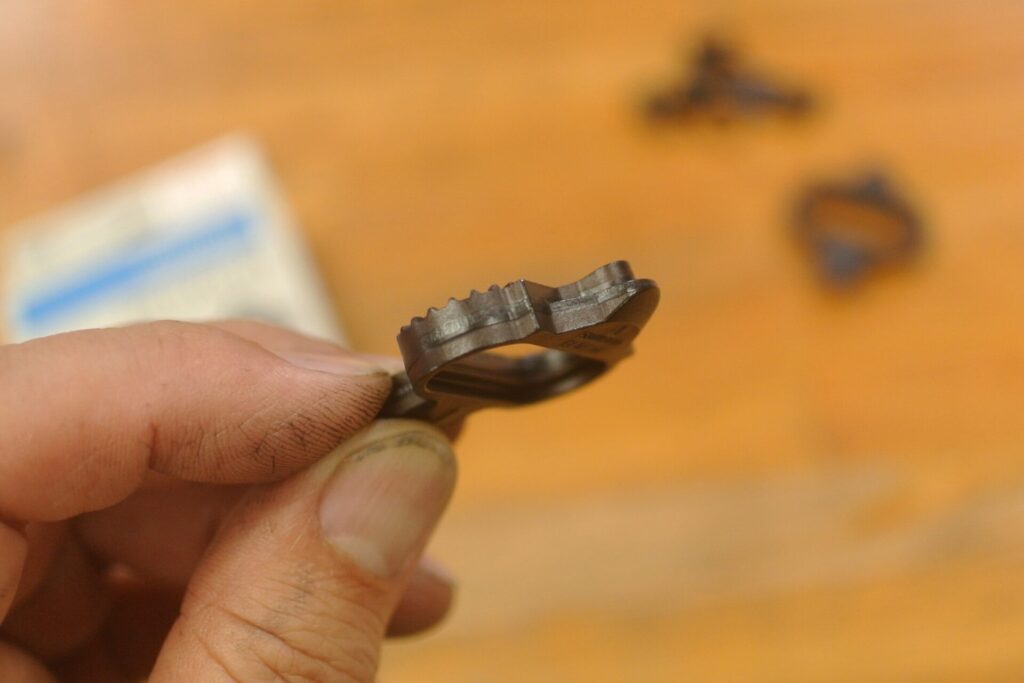 シマノのSPDクリートの新製品「CL-MT001」です。 「クリートなんて大して変わらんだろ」とあまり期待せずに使ってみたのですが… これ、良いですよ! クリップイン一発目で違いが分かりました。嵌めやすいです。 従来のクリート「SM-SH51」と違うのは先端部の形状です。先端を尖らせるように面取りしてあります。これによってペダル真上からのステップインが可能になったのです。 ペダルの上に適当にクリートを置いてもパチッと嵌まってくれるのは嬉しい。 漕いでいるときのホールド感と、リリースするときの感触は従来の「SM-SH51」と同じでした。 新型クリート「CL-MT001」¥1,940で販売してます。是非どうぞ。